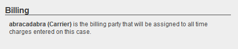- On the Case Details page, we have added the ability to set a default Billing Party for all time charges. It is located at the bottom of the Case Info box, and only Firm Administrators have the ability to set this. Selecting a party here will auto select the Bill To field of all charges entered on this case to the party you choose.